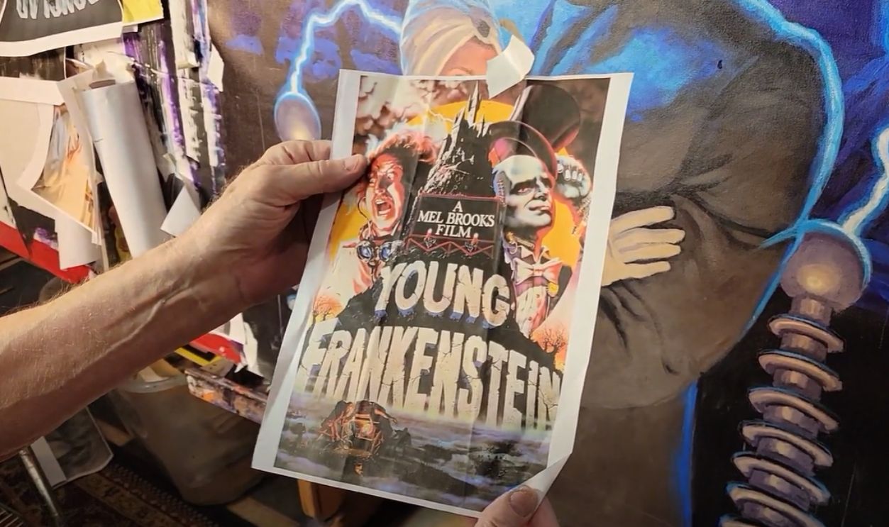 Famous poster artist John Alvin created the crazy poster for Young Frankenstein. It features Gene Wilder as Dr. Frederick Frankenstein, alongside Peter Boyle as the Monster and Marty Feldman as Igor. Alvin has designed posters for films like Blade Runner as well.